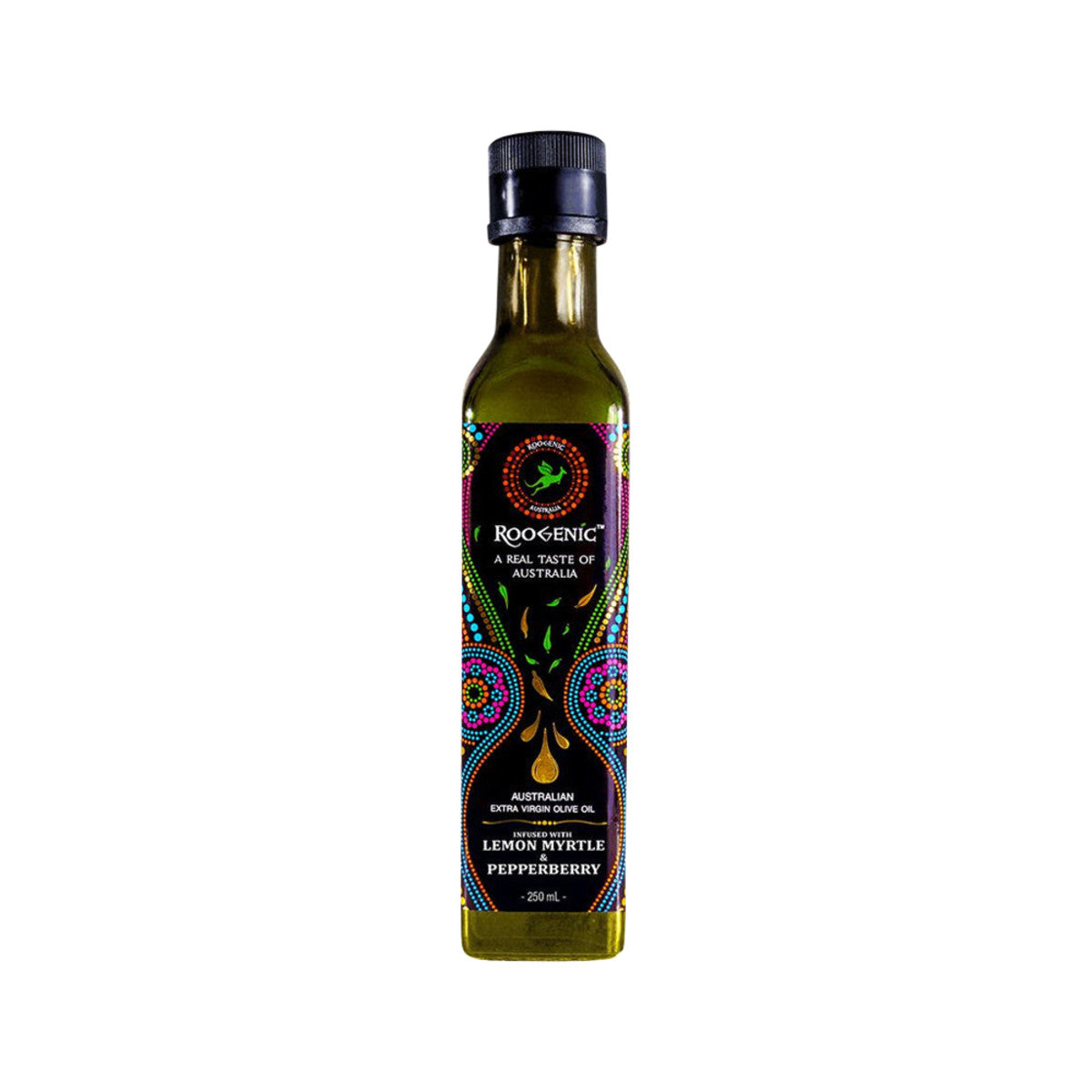 Roogenic Australia Australian Extra Virgin Olive Oil Infused With lemon Myrtle & Pepperberry has a light herbaceous flavour, with a striking lemony flavour and mild pepperiness.